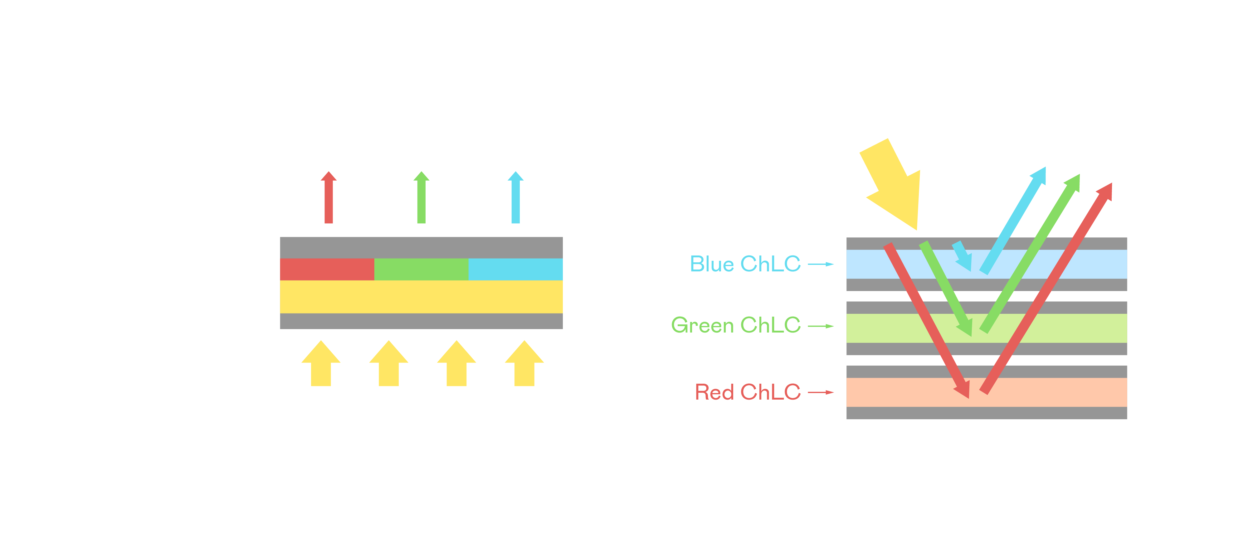 AG百家乐胆固醇液晶显示器是由红、绿、蓝三层胆固醇液晶面板堆叠而成,并采用无彩色滤光片设计,减少环境光在反射过程中的损耗。